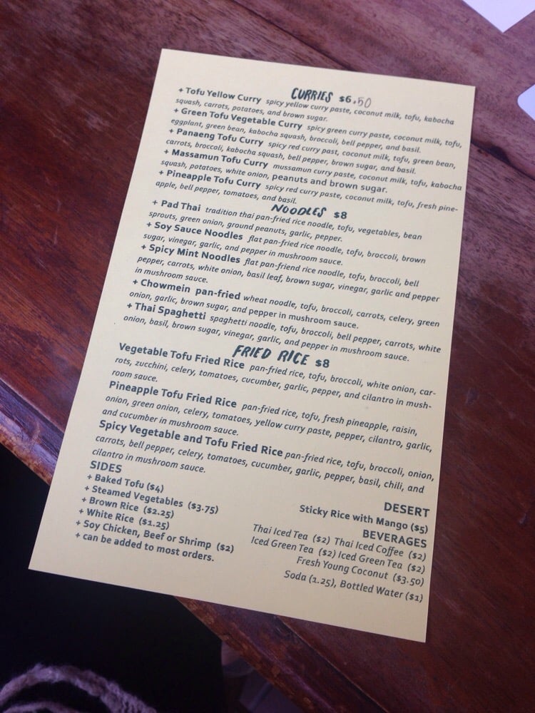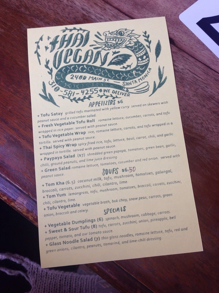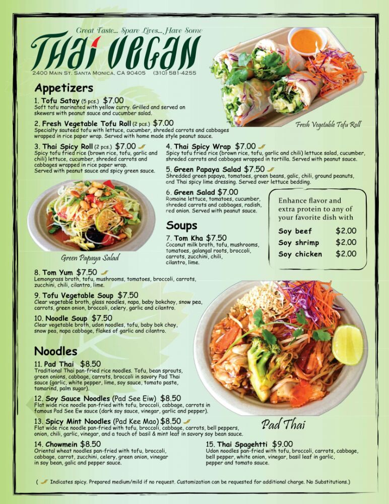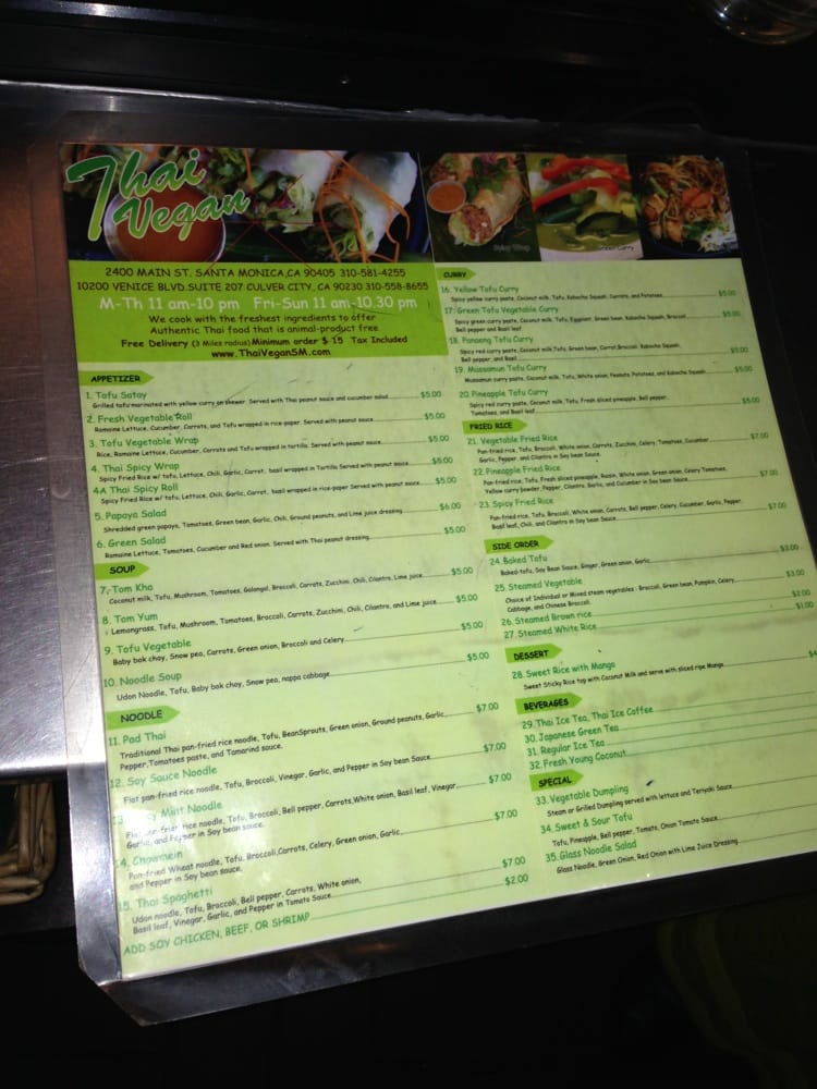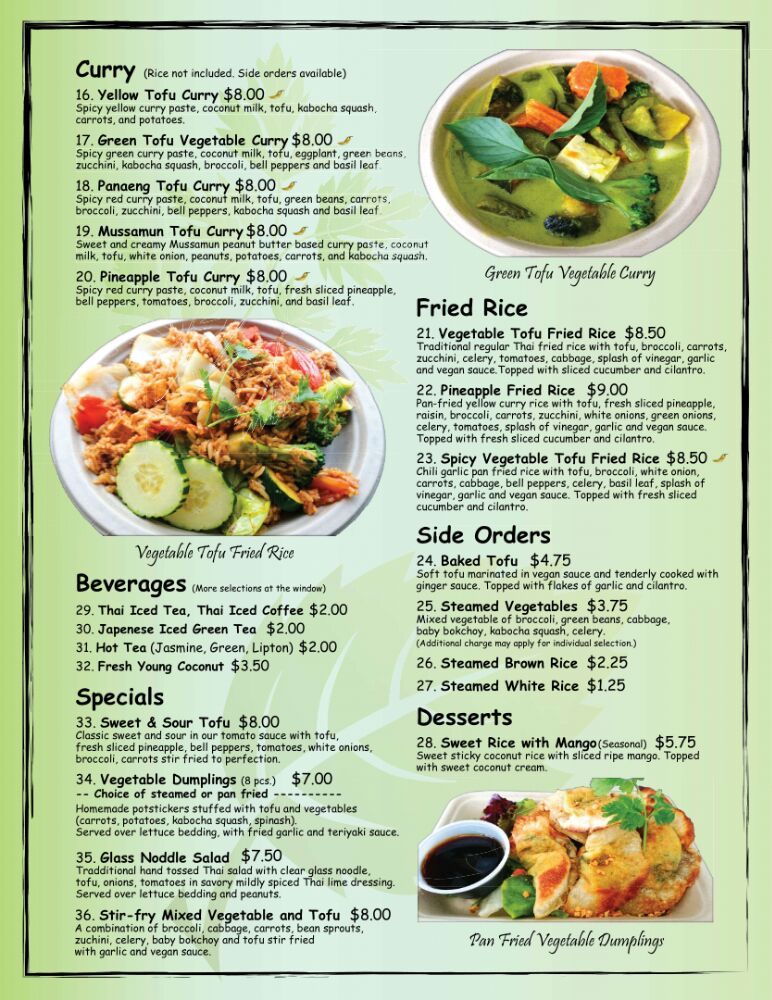 Introducing the menu at Thai Vegan, located in Santa Monica, CA, offers a wide array of vegan and vegetarian options for delivery, takeout, and dining in. From classics like Sweet and Sour Tofu to StirFry Mixed Vegetable and Tofu, the menu boasts delicious and flavorful dishes. The Tofu Satay and Fresh Rolls make for appetizing starters, while the Thai Iced Tea and Japanese Iced Green Tea provide refreshing beverage choices. Customers rave about the flavorful dishes such as soy chicken larb and pad Thai, complemented by friendly staff and generous portions. With a diverse menu and cozy ambiance, Thai Vegan is a must-visit for any vegan or vegetarian food enthusiast looking for a taste of authentic Thai cuisine.